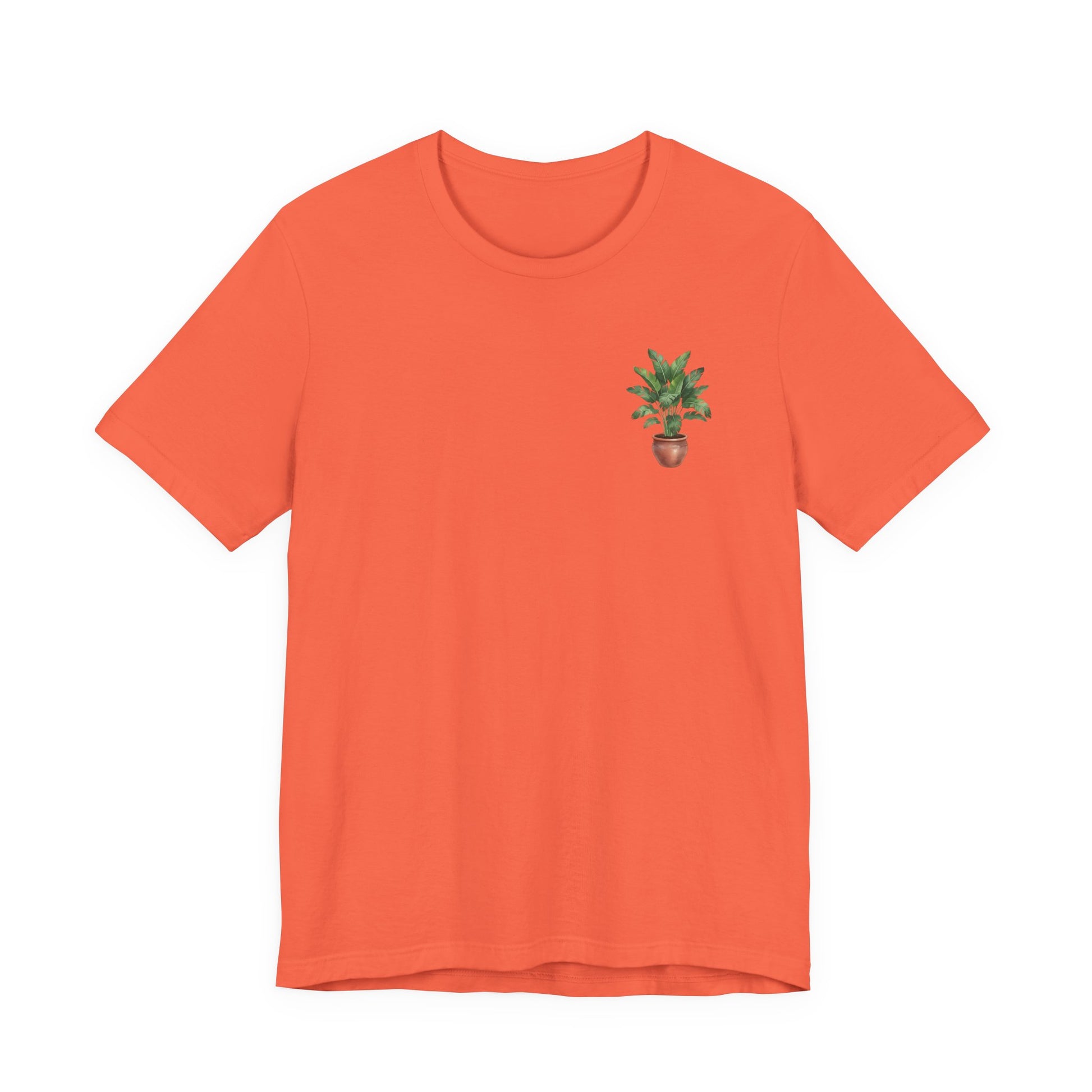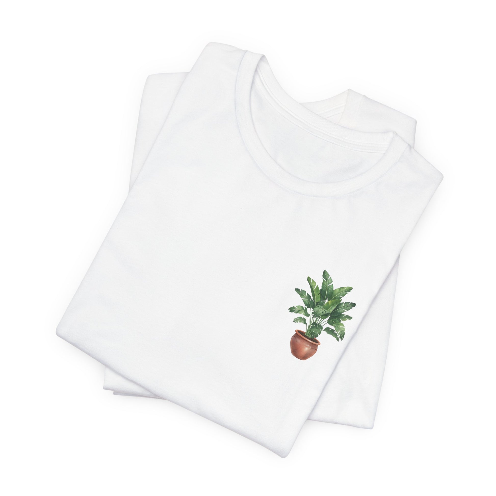 Carry a piece of the tropics with our "Pocket Strelitzia" t-shirt! This elegant design features a charming, hand-drawn illustration of a vibrant Strelitzia plant (Bird of Paradise) in a classic terracotta pot, subtly placed over the left chest area. Its iconic broad leaves bring an exotic yet minimalist touch to your style. Perfect for plant enthusiasts, lovers of tropical aesthetics, or anyone who appreciates sophisticated, nature-inspired fashion